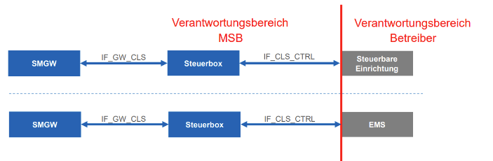 Der Verteilnetzbetreiber gibt die sogenannten Steuerungsaufgaben an den Messstellenbetreiber weiter – er definiert also die Maßnahmen, beispielsweise eine Reduzierung der Wirkleistung einer, während die Steuerbox unter Verantwortung des Messstellenbetreibers die Umsetzung vornimmt.